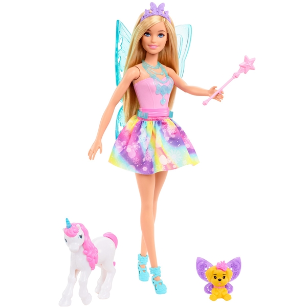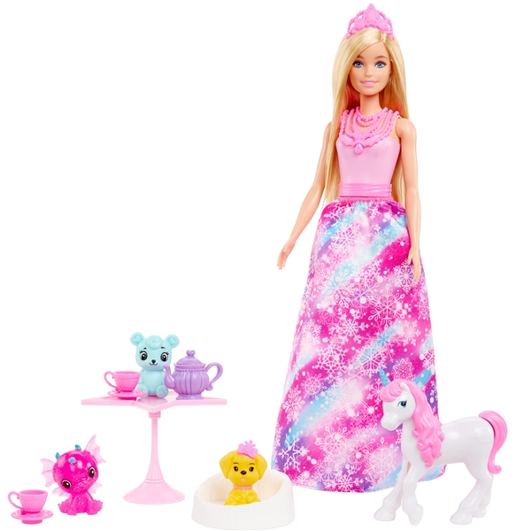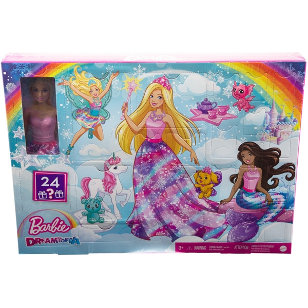 Du kan tælle dagene ned til juleaften med denne Barbie Dreamtopia-julekalender med gaveoverraskelser hver dag! Barnet får Barbie-dukken på den første dag, og derefter gemmer dagens låge på en ny overraskelse. Overraskelserne består af tilbehør, legesager og tøj som gør at barnet kan klæde Barbie-dukken ud som en prinsesse, havfrue eller alf. Hver ny overraskelse skaber nye muligheder for at kombinere og fortælle et nyt eventyr. Tilbehør og legesager som f.eks. tiaraer, halskæder, kæledyr og dele til et teselskab gør legen meget sjovere!