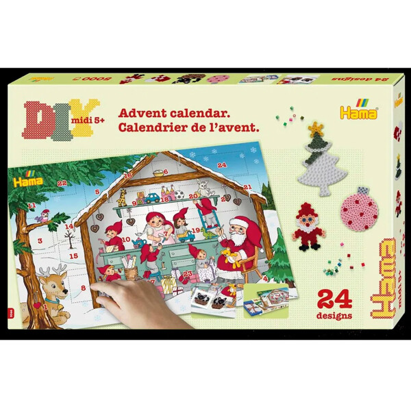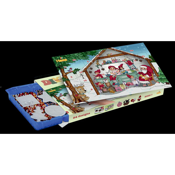 Julekalender med cirka 5000 perler, 5 perleplader og 24 udskrevne motivark samt vejledning og strygepapir.