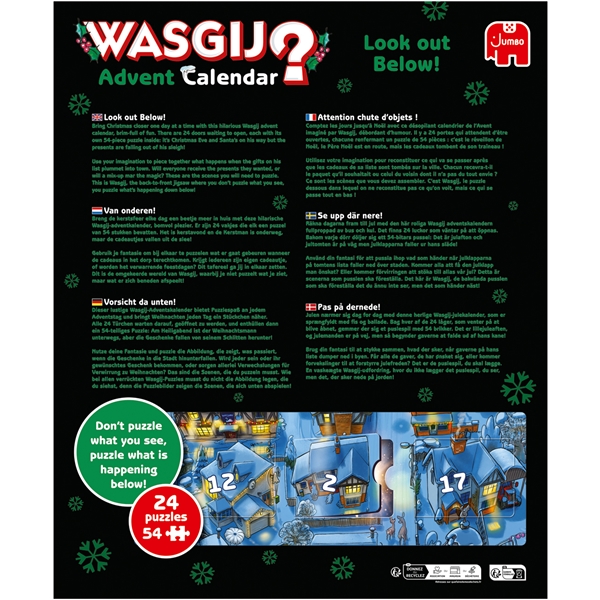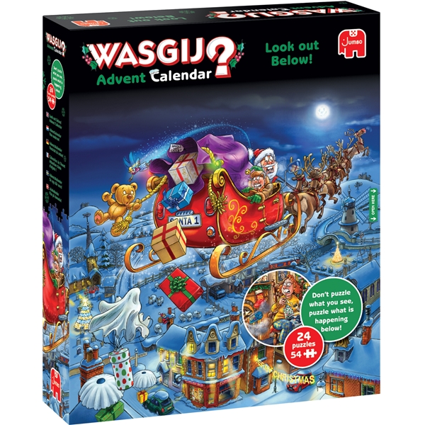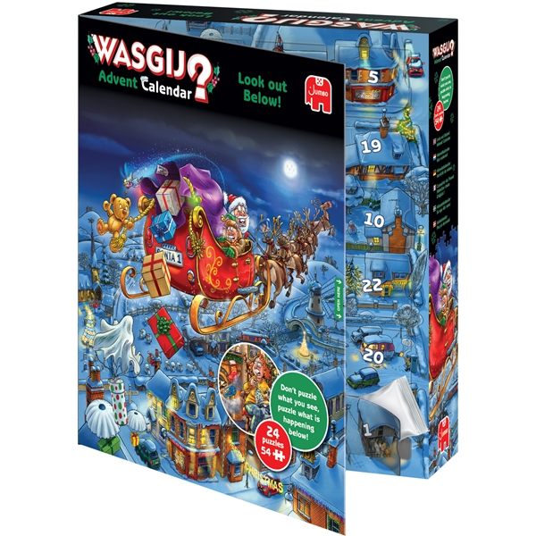 Tæl dagene frem til jul med denne sjove Wasgij julekalender fyldt med sjov og ballade. Der er 24 låger, der venter på at blive åbnet. Bag hver dør gemmer der sig et 54-brikkers puslespil: Det er juleaften, og julemanden er på vej, men gaverne falder ud af hans slæde!