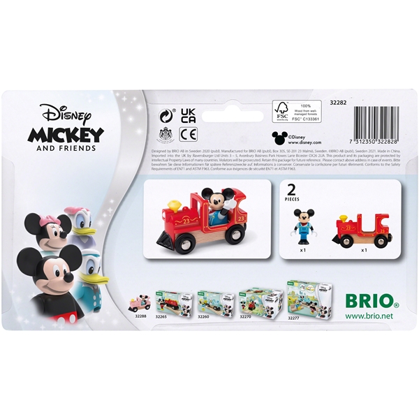 BRIO 32282 Mickey Mouse & Lokomotiv er et rødt damptog med et retroagtigt Disney-design, der tager dig med ud på spændende eventyr. Lokomotivet leveres med en Mickey Mouse-figur i lokomotivføreruniform, der kan tage dig med rundt i byen. Dette damptog kan kobles til andre BRIO-tog og -køretøjer ved hjælp af magnetkoblingerne.