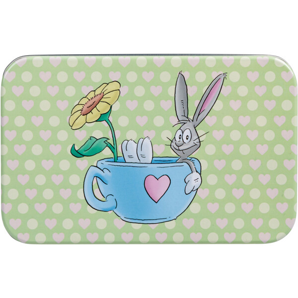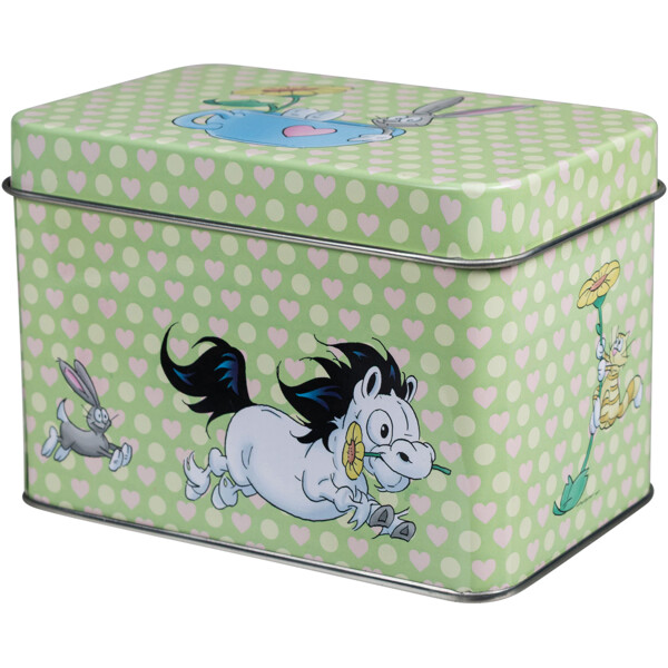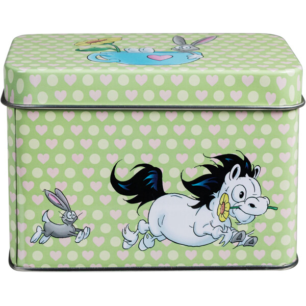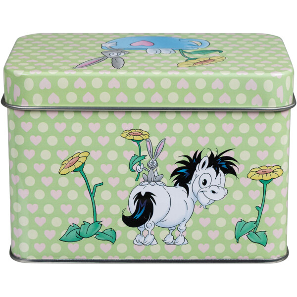 En smuk lysegrøn te-dåse af metal, hvor hesten Mulle og hans venner tilbringer en dejlig sommerdag blandt gule solsikker. Dåsen har et separat låg, der er let at trykke på dåsen.