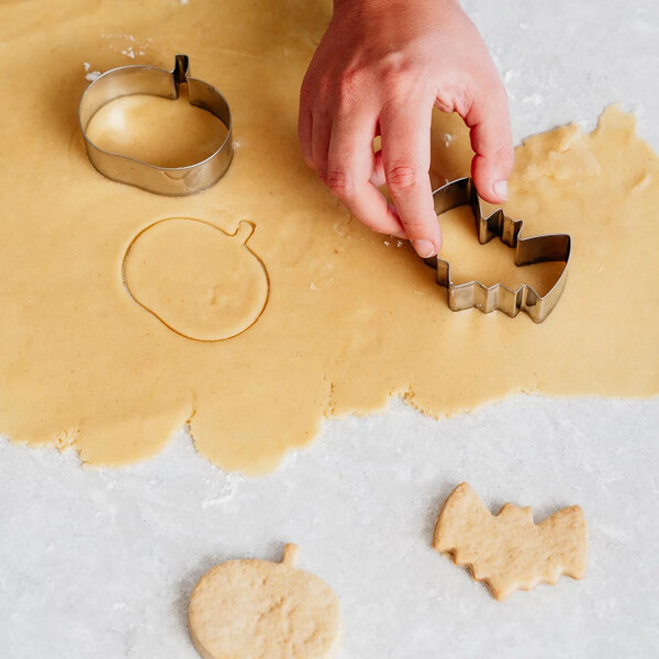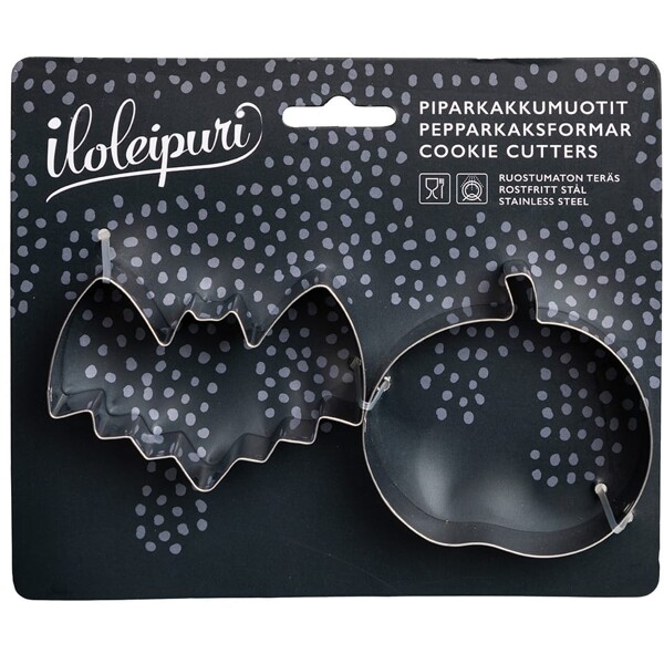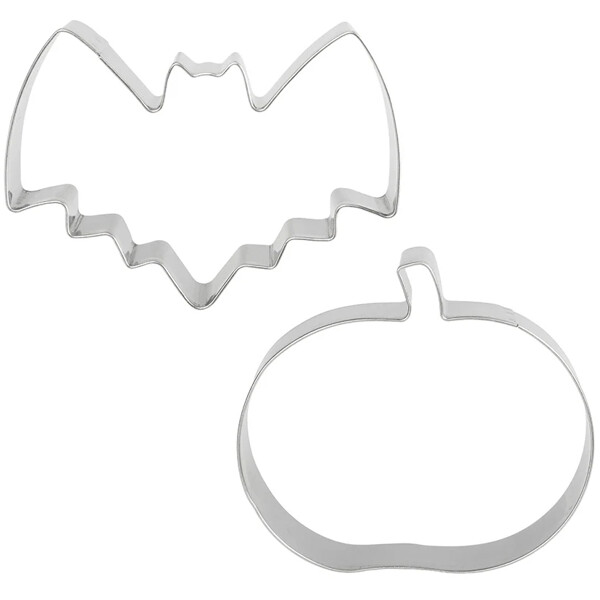 To sjove peberkageforme i Halloween-tema, et græskar og en flagermus. Formene er 6-7 cm høje. Bag og dekorer til Halloween, fester og sammenkomster. Kager, der har en sjov og kreativ form, smager endnu bedre!