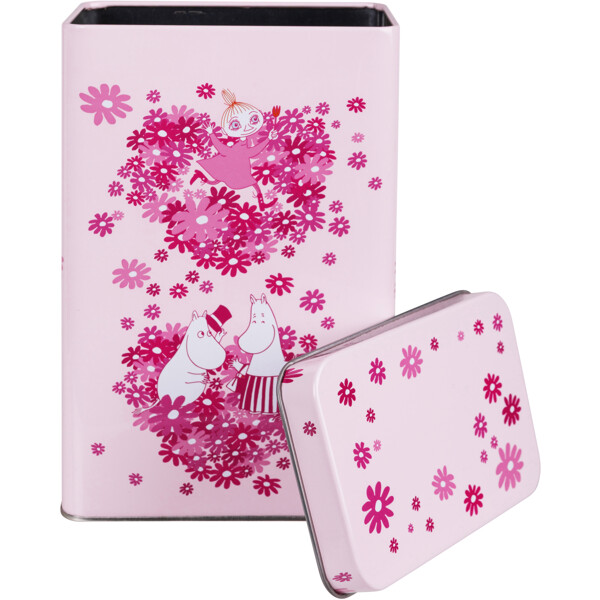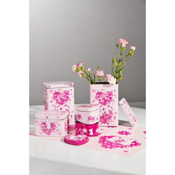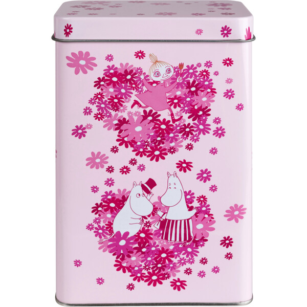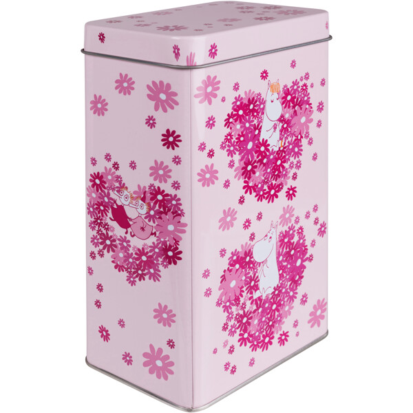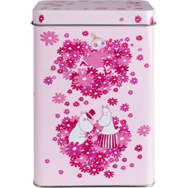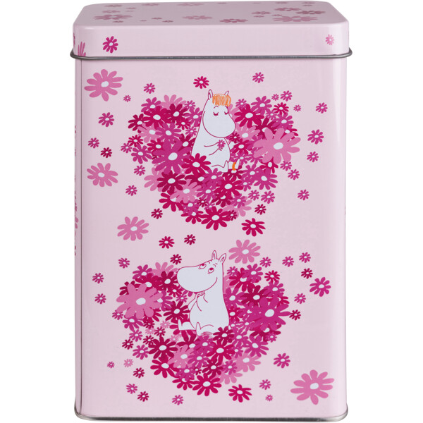 Kaffedåse i metal med et kærligt mumimotiv og et låg, der kan tages helt af. Dåsen er lyserød med mønster i forskellige nuancer af mørkere lyserød.