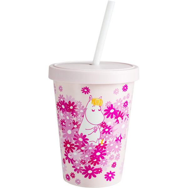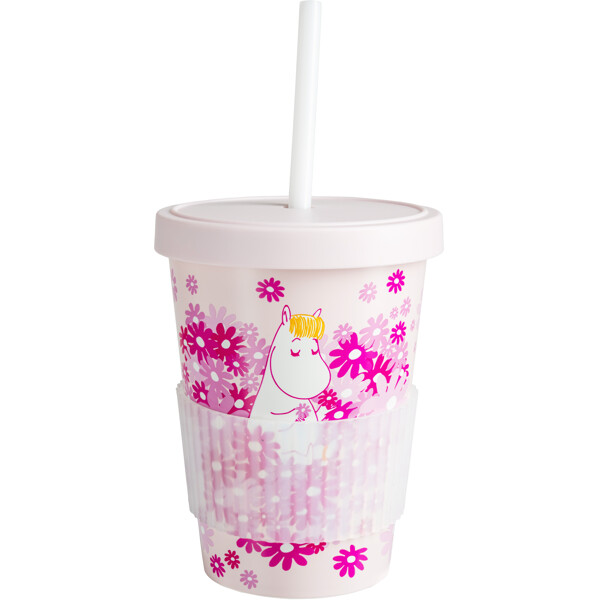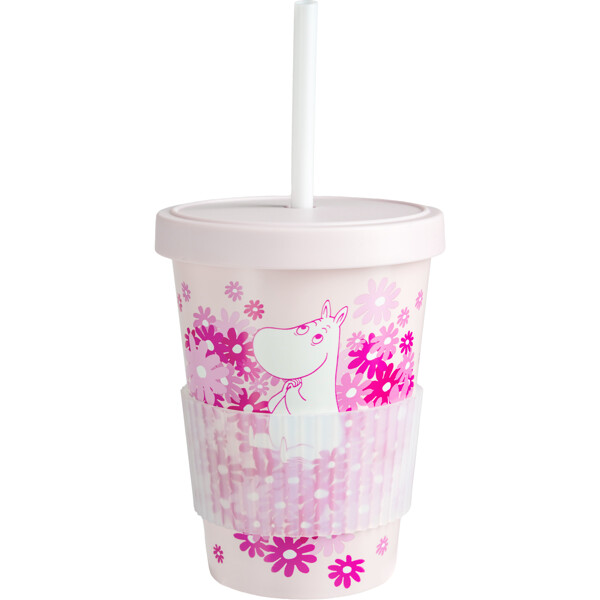 En sød, lyserød sugerørskop med låg, fremstillet i genbrugsplast, med et kærligt Mumi-motiv.