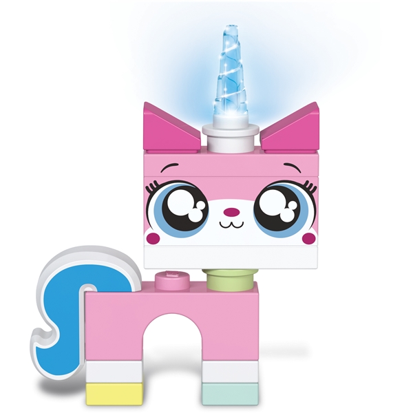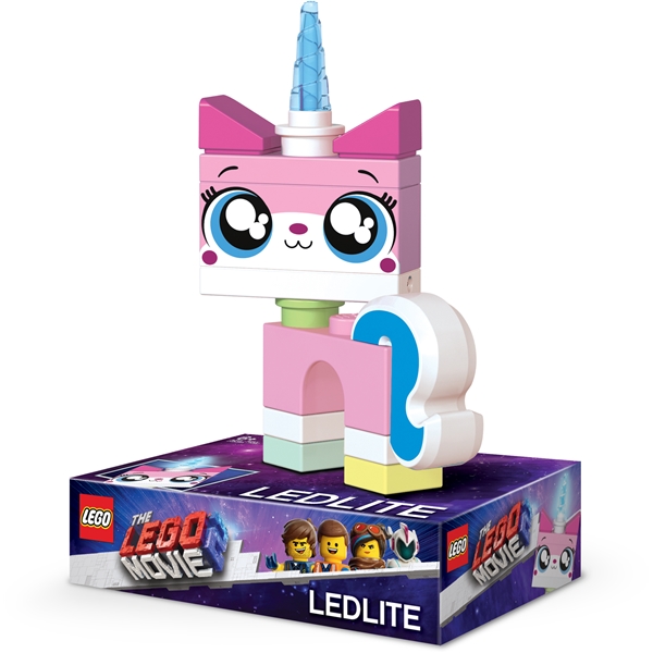 Lampe i form af Dansekat fra LEGO Movie 2. Tryk på hendes næse for at få hornet til at lyse. Hovedet kan drejes. Lampen slukkes automatisk efter 15 minutter. Kræver 3 x AAA-batterier 1,5V (medfølger).