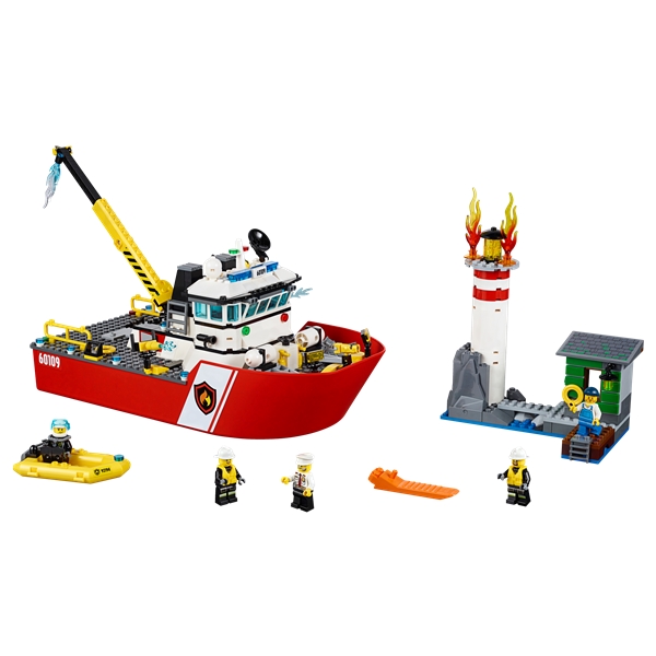 Tag brandvæsnets båd, og red fyrtårnet og fyrmesteren! Sluk branden i fyrtårnet med LEGO® City brandvæsnets båd med bevægelig kranarm, knopskydende vandkanon, der kan vælte flammerne, samt gummibåd, brandmandsudstyr, køkken, lægestation og anløbsbro. Fem minifigurer medfølger: kaptajnen, en kvindelig og to mandlige brandmænd og en fyrmester.