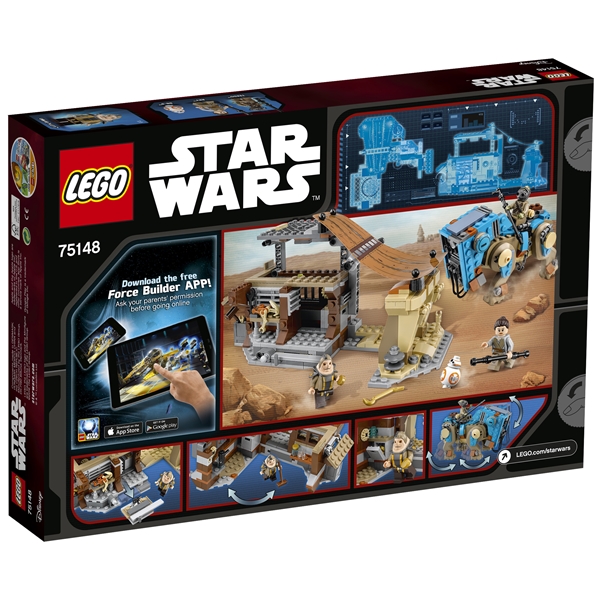 Stop tyven ved Unkar Plutts markedsbod! Følg med Rey og hendes makker BB-8 når hun handler med skrotdele i Unkar Plutts markedsbod. Men pas på! Teedo på sin Luggabeast prøver at kidnappe BB-8! Kan du hjælpe Rey med at komme til undsætning og forhindre den lille tyv i at slippe væk? Det er op til dig...75148 LEGO Star Wars Mødet på Jakku indeholder minifigurerne Rey, Teedo og Unkar Plutt samt BB-8 og en Luggabeast. Markedsbod med bord, pengeskab, beholder med reservedel, skjulte våben, presenning, forskelligt tilbehør og et design, der kan foldes ud for at gøre det nemt at komme ind og lege. Luggabeast har tung pansring, sæde til en minifigur og justerbart hoved og ben. Medfølgende våben er Reys og Teedos stave. Fold markedsboden ud for at skabe en større model, som er nemmere at lege med. Medfølgende tilbehør er en skiftenøgle, en kop og en kost. Genskab spændende scener på ørkenplaneten fra succesfilmen "Star Wars: The Force Awakens". Det perfekte tilskud til hver eneste LEGO® Star Wars-samling. Sættet er velegnet til byggere fra 8 til 14 år. Markedsboden er over 11 cm høj, 10 cm bred og 20 cm dyb når den er lukket, og over 15 cm bred når den er åben. Luggabeast er over 11 cm høj, 12 cm lang og 6 cm bred.75148 LEGO Star Wars Mødet på Jakku indeholder 530 dele.