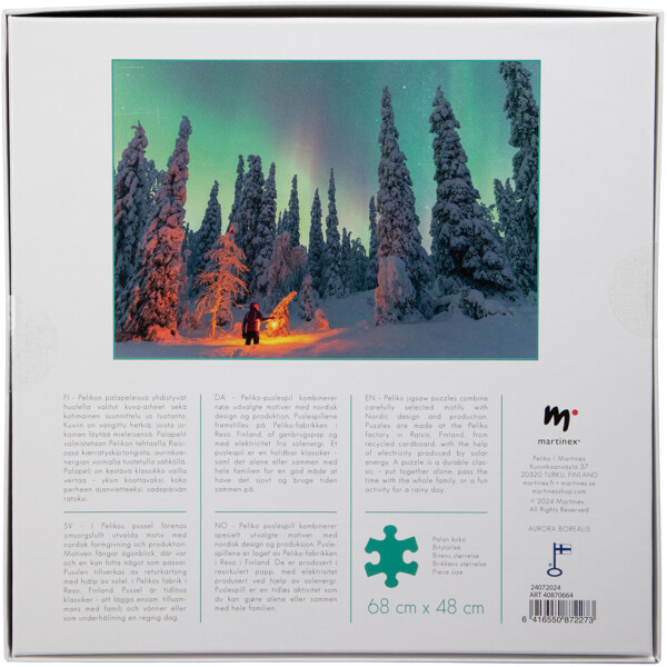 Puslespillet er fremstillet i genbrugskarton, og det lagte puslespils størrelse er 68 x 48 cm.