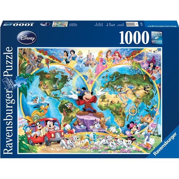 Puslespil 1000 Brikker Disney's World Map har et motiv af et verdenskort med Mickey Mouse i midten, der er iklædt sin magiske troldmandshat. Kortet viser hvor i verden de forskellige velkendte Disney-figurer bor, og langs kanten ses en række figurer du kender fra Disneys magiske verden. Hvor mange film kan du finde på puslespillets farverige motiv?