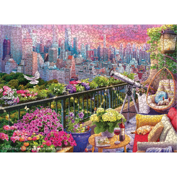Slap af på et frodigt tag i New York, hvor blomsterkasser flyder over, lyskæder gløder, og et teleskop peger mod en pastelrosa silhuet over Central Park. Med tydelige zoner – solnedgangshimmel, skyskrabere, træer, rækværk, blomster, teleskop og hyggelige siddepladser – er dette et velvære-motiv.