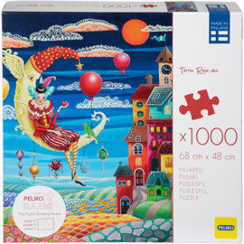Et puslespil med 1000 brikker og et charmerende og detaljeret motiv i klare farver, skabt af den finske kunstner Terttu Raja-aho. Den søvnløse klovn sidder på månen med benene dinglende og et æble i hånden.