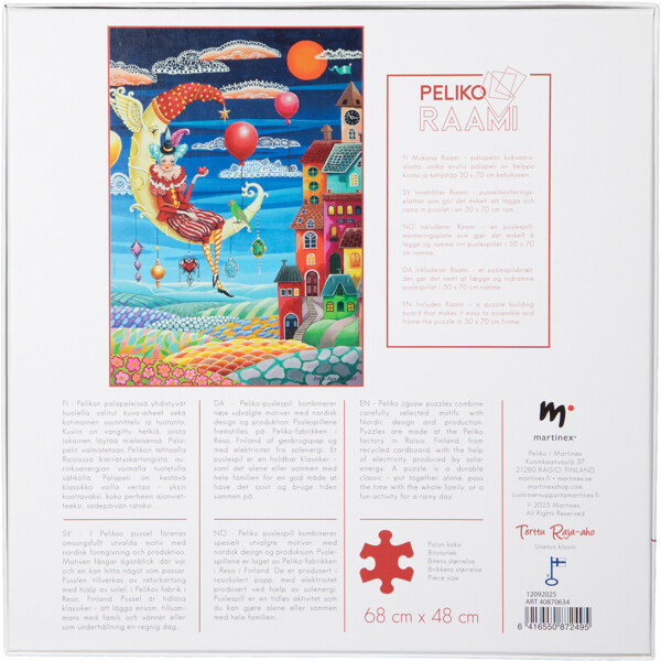 Indeholder puslespilsunderlaget Peliko Raami, som gør det nemt at bygge og indramme billedet i en standardramme på 50 x 70 cm.