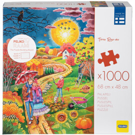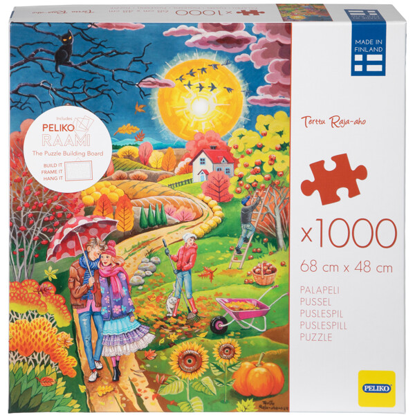 Et puslespil med 1000 brikker og et romantisk og detaljeret motiv i efterårets smukke farvetoner, skabt af den finske kunstner Terttu Raja-aho. En hyggelig efterårstur sammen blandt æbletræerne, på den snoede rute over bakker og enge.