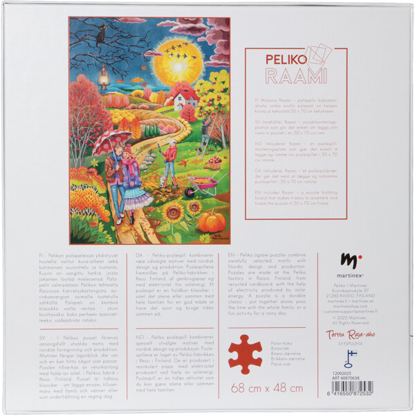 Indeholder puslespilsunderlaget Peliko Raami, som gør det nemt at bygge og indramme billedet i en standardramme på 50 x 70 cm.