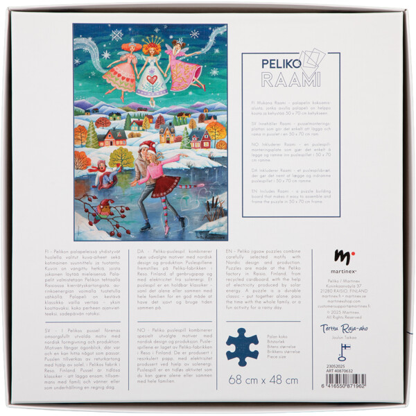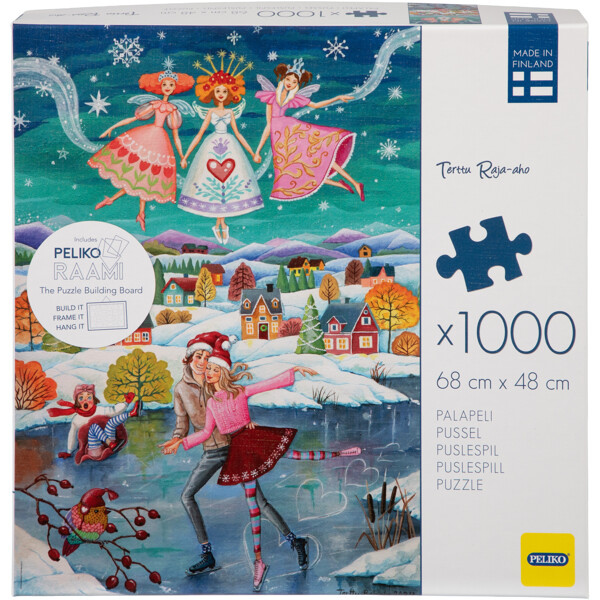Et 1000-brikkers julepuslespil med et vidunderligt og stemningsfuldt motiv skabt af den finske kunstner Terttu Raja-aho. Juledagen kan fejres romantisk ved at stå på skøjter i det smukke vinterlandskab.
