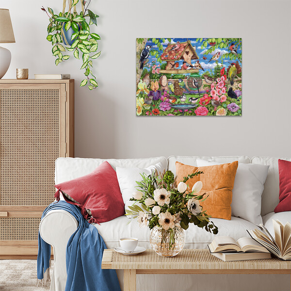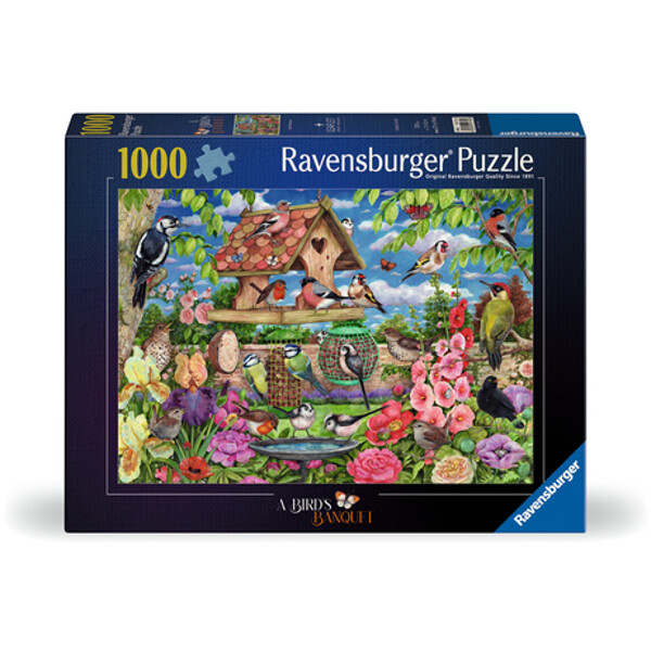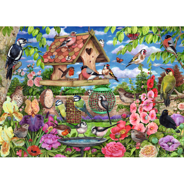 På det store fuglebræt sidder en rødhals, dompap, bogfinke, en stillits og en halemejse. Et par glade blåmejser nyder jordnødderne blandt blomsterne. Der er endda et par spætter, der kigger og venter på en mulighed for at komme ned, tilsyneladende bevidste om, at deres størrelse kan skræmme de mindre fugle væk. Mens de er ved vandskålen, slukker yderligere to mejser og en rødhals deres tørst.