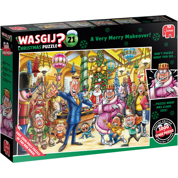 Dette er et Wasgij-sæt med 2 x 1000 brikker, hvor du kan pusle billedet, der vises ovenfor, OG billedet af "løsningen".