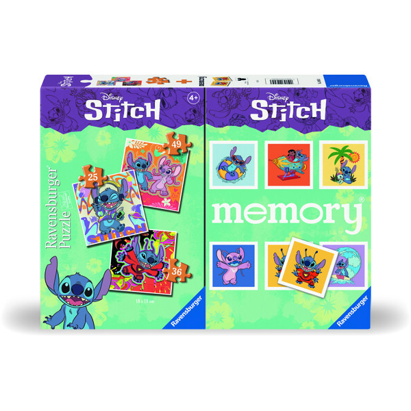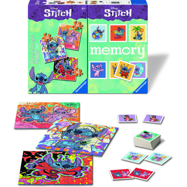 Med dette kombinationsprodukt bestående af et mini memory og tre puslespil med 25, 36 og 49 brikker får Stitch-fans valuta for pengene.