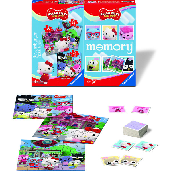 Fire Ravensburger-klassikere møder Hello Kittys fortryllende, farverige verden: Et memory-spil med 48 kærligt designede kort og tre farverige puslespil med varierende antal brikker sikrer en varieret og sjov legetid på børneværelset.