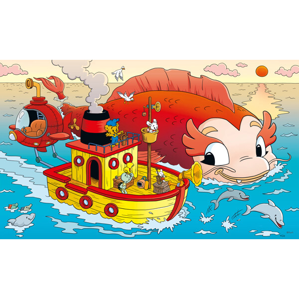 Puslespil 100 Brikker Bamse Havets Hemmelighed er et fint pappuslespil med Bamse og hans venner. Vennerne er ude på havet med Victoria og møder en meget stor fisk.