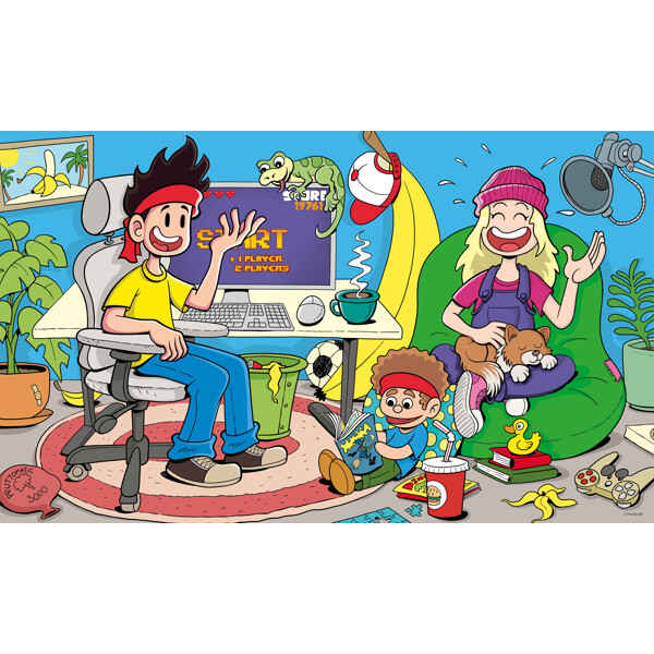Et 100-brikkers puslespil med Yumi & Tomu, hvor de begge slapper af foran skærmen.