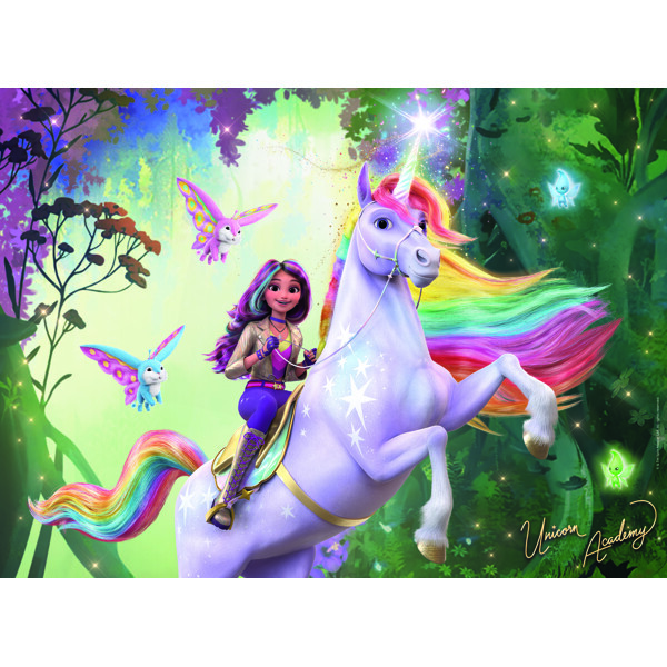 Puslespil XXL 100 Brikker Unicorn Academy er et fint puslespil med motiv fra Netflix-successerien Unicorn Academy. Sophia og hendes enhjørning Wildstar er ude og rider i naturen.