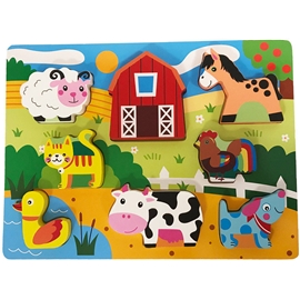 Glade motiver og stærke farver gør det sjovt at samle puslespil, og samtidig udvikles barnets opfattelsesevne og fingerfærdighed. Barnet kan ligeledes lege med disse holdbare puslespilsbrikker. Puslespillets tema er bondegårdsdyr.