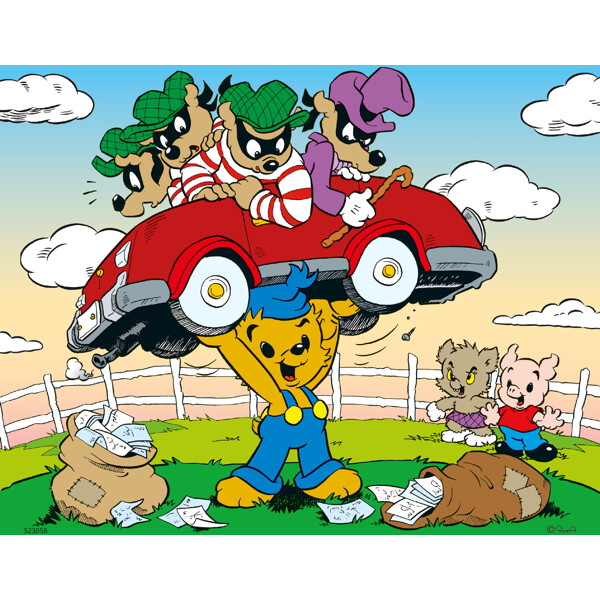 Et fint træpuslespil med Bamse. Bamse er ude på eventyr og støder pludselig på en flok bøller.