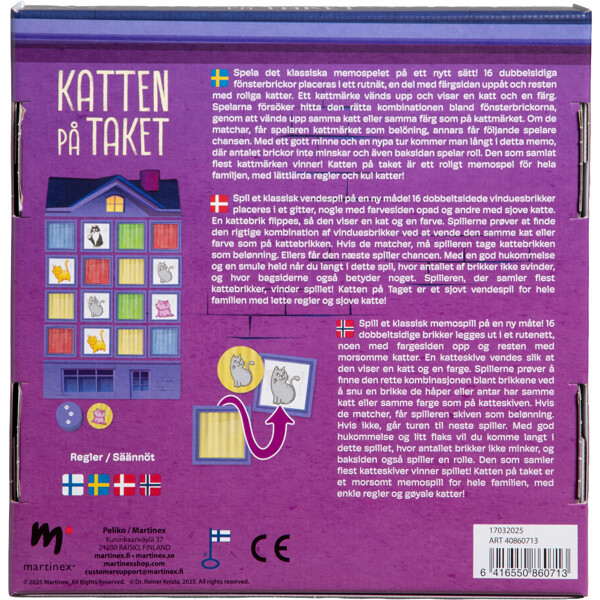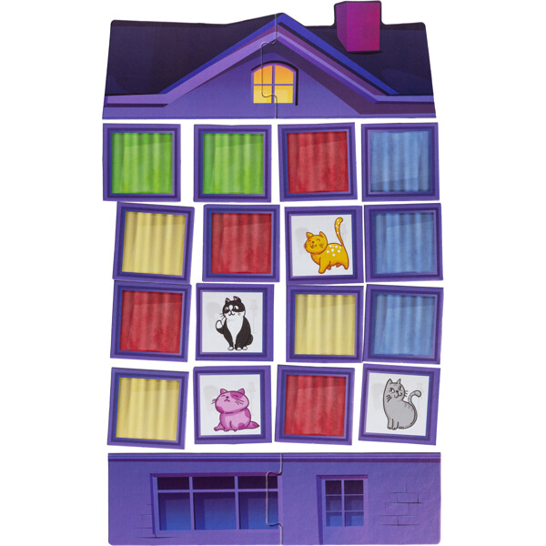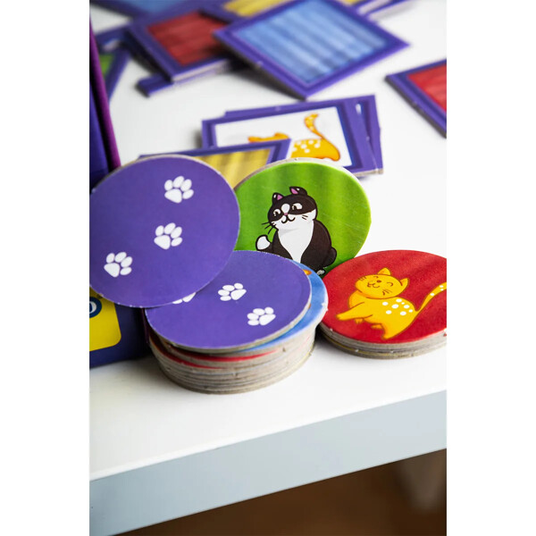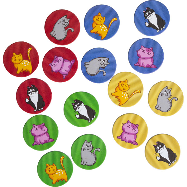 16 memobrikker lægges ud, nogle med farvesiden opad og resten med sjove katte. Ved hver spillerunde vises et rundt kattemærke med kat og baggrundsfarve. Spillernes opgave er at finde den helt rigtige kombination af kat og farve ved at vende en memobrik. Hvis både farve og kat passer, får spilleren kattemærket, og den der samler flest brikker vinder. Sjovt for hele familien!