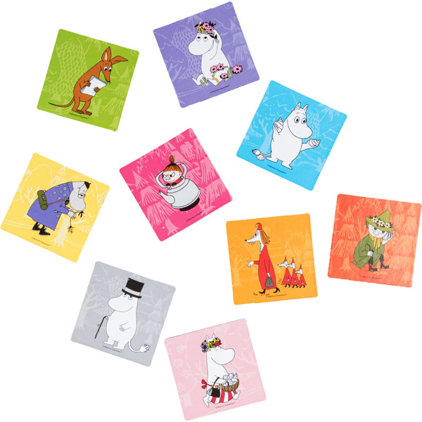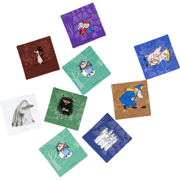 Et klassisk huskespil med 18 par brikker med sjove mumimotiver på farverige baggrunde.