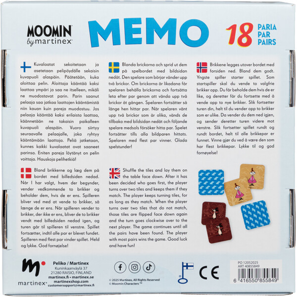 Huskespillet er fremstillet i Finland af genanvendt pap. Regler på SV, FI, DA, NO, EN.
