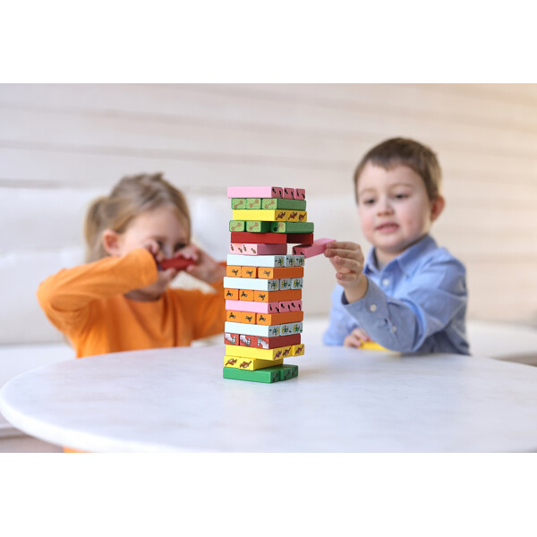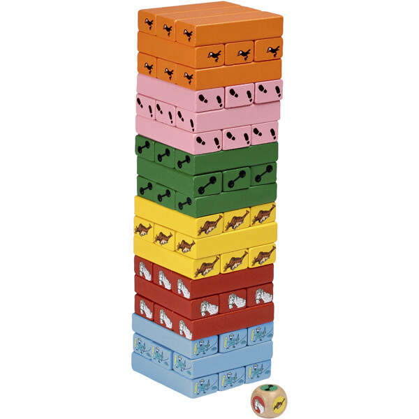 Byg tårnet, skift til at tage klodser og se, hvem der får det til at falde. Spillet kan spilles med eller uden terning, hvilket gør det lige så sjovt for begyndere som for lidt større børn. Med 55 dele i holdbart materiale byder spillet på masser af grin, koncentration og spænding.