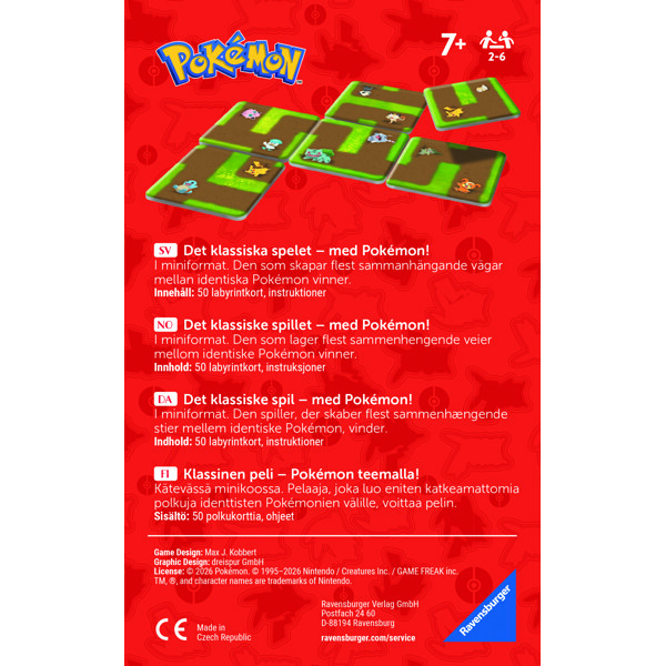 Spillerne skiftes til at lægge brikker og bygger sammen en konstant foranderlig labyrint! Målet er at skabe en sammenhængende vej mellem to ens Pokémon. Lykkes det, får du beholde brikken, der allerede ligger i labyrinten. Hvem samler flest brikker – og flest Pokémon som Pikachu, Bulbasaur, Squirtle og mange flere?