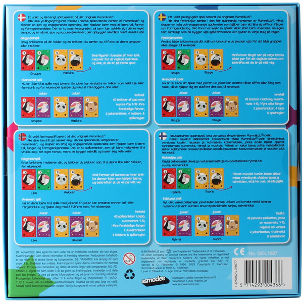 Et unikt pædagogisk spil baseret på originalen Rummikub. Alle dine yndlingsdyr samles i denne spændende version af Rummikub, hvilket skaber en sjov og engagerende oplevelse, der hjælper børn med at lære tal, farver og formgenkendelse. Der er to niveauer af spillet, hvilket lader børn udvikle sig i deres eget tempo, samtidig med at de opbygger selvtillid og nyder hvert skridt på vejen.