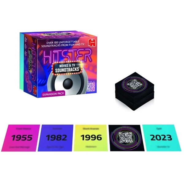 HITSTER: Movies & TV Soundtracks - Expansion Pack.Oplev den ultimative samling af film- og tv-favoritter med HITSTER: Movies & TV Soundtracks!Hvad handler spillet om?Dyk ned i en nøje udvalgt samling af de mest ikoniske filmmusik- og tv-soundtracks gennem tiderne. Den første spiller, der formår at opstille 10 sange i kronologisk rækkefølge, bliver HITSTER-mesteren!Hvordan fungerer det?Scan QR-koden på kortene, og sangen afspilles automatisk via Spotify. Intet abonnement kræves – kun en smartphone med internetforbindelse!Indhold i udvidelsen:154 kort med legendariske filmmusik- og tv-soundtracks.En spændende tilføjelse til grundspillet HITSTER!Perfekt til filmelskere og musikentusiaster.Hvorfor vælge HITSTER: Movies & TV Soundtracks?Let at lære, sjovt at spille!Perfekt til spilaftener, fester og nostalgiske musikstunder.Lad musikken guide dig gennem tidsepoker fra 1940 til 2023.Er du klar til at sætte dine film- og tv-musikfærdigheder på prøve?OBS! Dette er en udvidelse og kræver HITSTER grundspillet for at kunne spilles.