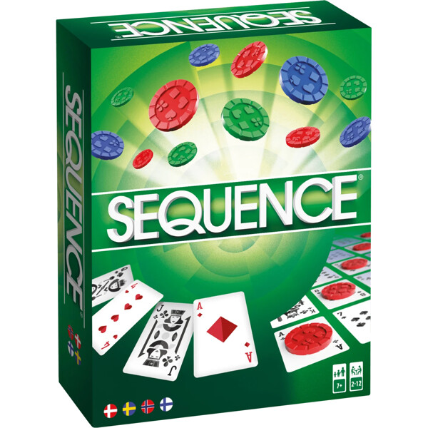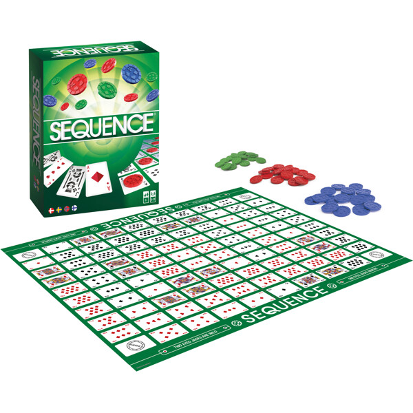 For at vinde i Sequence skal du være den første til at få to rækker med fem spillebrikker i hver række på spillepladen. Spil et kort og placer en spillebrik med det tilsvarende kort på spillepladen. Pas på knægtene. Nogle af dem er frikort, nogle er skurke, der giver dig mulighed for at flytte en af modspillernes spillebrikker. Kampen tilspidses for hver runde. Timing, strategi og lidt held er, hvad der kræves i Sequence - selskabsspillet, der er fuld af overraskelser.