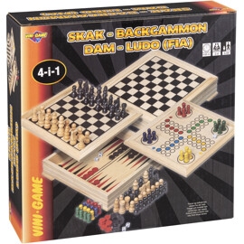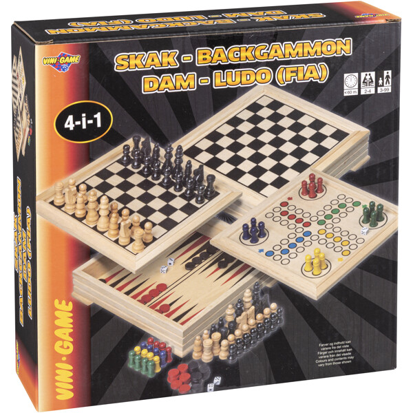 Vini 4-i-1 Træspil er fire spil i samme produkt! Spil skak, Ludo, backgammon eller dam. Perfekt for dig, der kan lide at spille, men har lidt plads!
