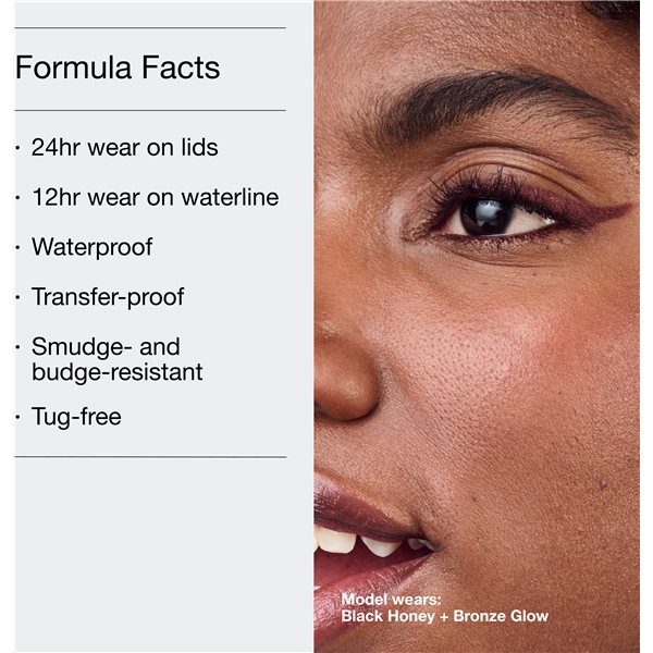 Eyelineren har en silkeblød gelékonsistens, som glider på uden afbrydelser, træk eller ryk med en ultrapigmenteret farve, som skaber en intensiv effekt i ét eneste strøg. Tværes ikke ud og holder hele dagen: 24 timer på øjenlågene, 12 timer på den våde kant!