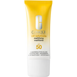 Clinique UV Solutions Mattifying Sunscreen SPF 50 er en let, oliefri solcreme til ansigtet, der giver høj beskyttelse mod solen samtidig med, at den effektivt kontrollerer glans. Perfekt til dig med fedtet, kombineret eller uren hud, der ønsker en mat finish uden at gå på kompromis med fugt.