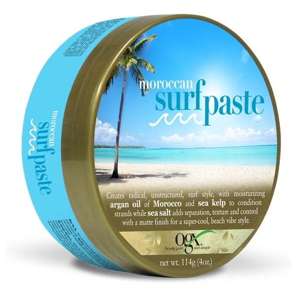 Ogx Moroccan Surf Paste indeholder arganolie og havkelp, som fugter hvert eneste hårstrå, mens havsalt giver håret tekstur og skaber en mat finish.