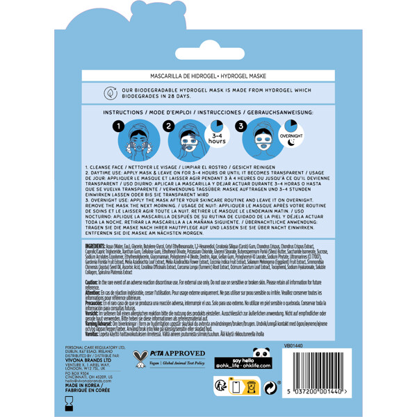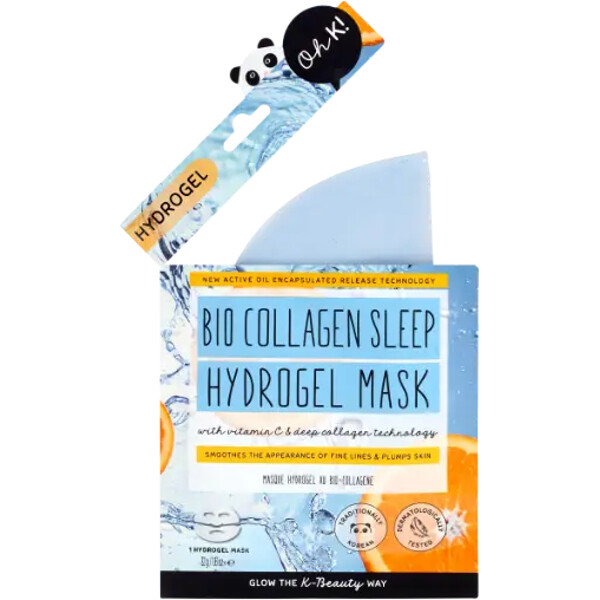 Oh K! Bio Collagen Sleep Hydrogel Mask indeholder en let, superadhæsiv hydrogel, der bliver gennemsigtig efter 4-5 timers brug. Kan anvendes om dagen eller natten over. Oliekapsler frigiver aktive ingredienser for dyb fugtning.