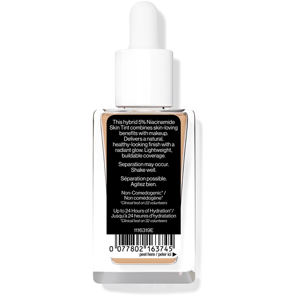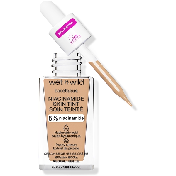 Bare Focus Niacinamide Skin Tint fra Wet n Wild er en medium dækkende foundation med plejende ingredienser. Få en sund glød på et øjeblik med hjælp fra denne lette foundation, der indeholder niacinamid, en ingrediens kendt for at lysne op. Den er opbyggelig og er beriget med en luksuriøs blanding af niacinamid, hyaluronsyre, pæonekstrakt og vitamin E.
