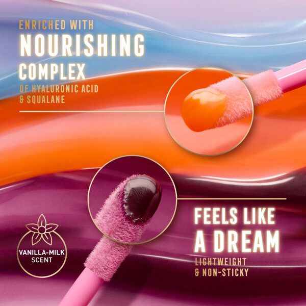 Den glansfulde geltekstur giver øjeblikkelig glans og efterlader en let farvestain, der bliver siddende med en fjerlet, ikke-klistret følelse. Formlen er beriget med plejende hyaluronsyre og squalane, som fugter læberne og har en blød, sød duft af vanilje.
