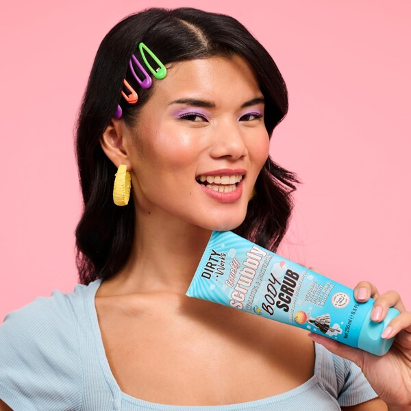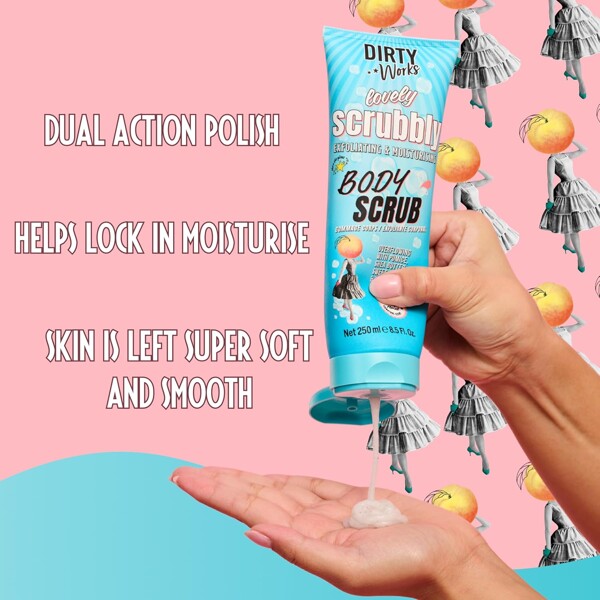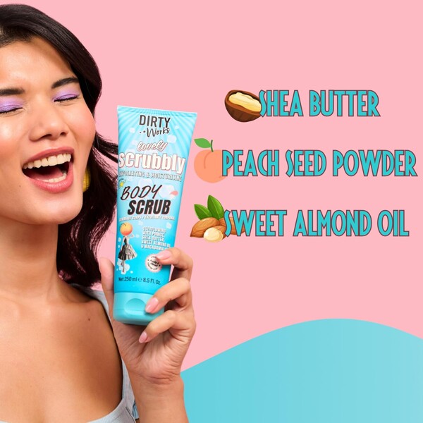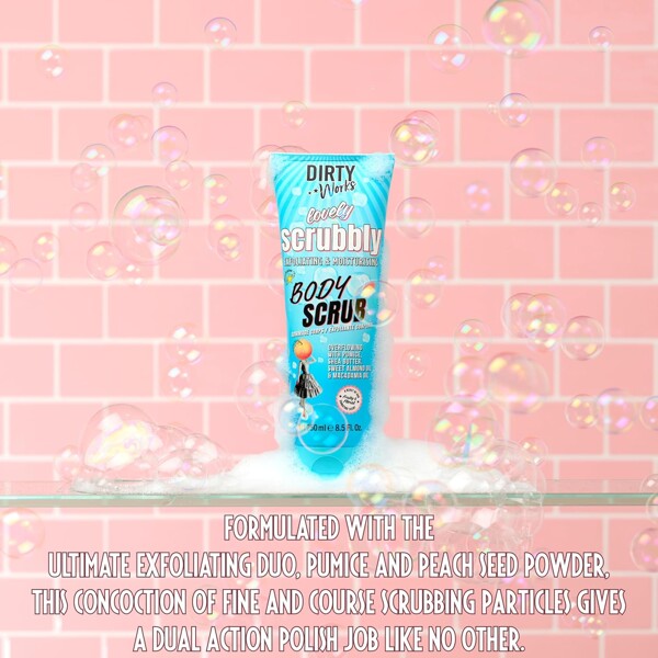 Vink farvel til tør, kedelig og flagende hud og oplev et blødere og fornyet selv fra top til tå med Dirty Works Lovely Scrubbly Body Scrub. Denne scrub indeholder eksfolierende pimpsten og knuste ferskenkerner, fugtighedsgivende sheasmørolie og blødgørende E-vitamin samt en eksotisk duft af æteriske olier fra soløje, neroli og jasmin.