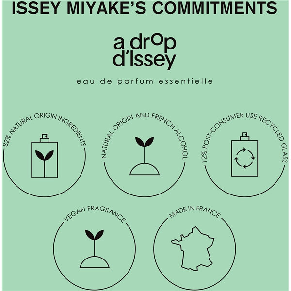 A Drop d'Issey Eau de Parfum Essentielle til kvinder er vegansk, og 82% af ingredienserne er naturlige. For at mindske den miljømæssige påvirkning er jasmin og appelsin genanvendte ingredienser, som er blevet udvundet fra konventionel produktion.