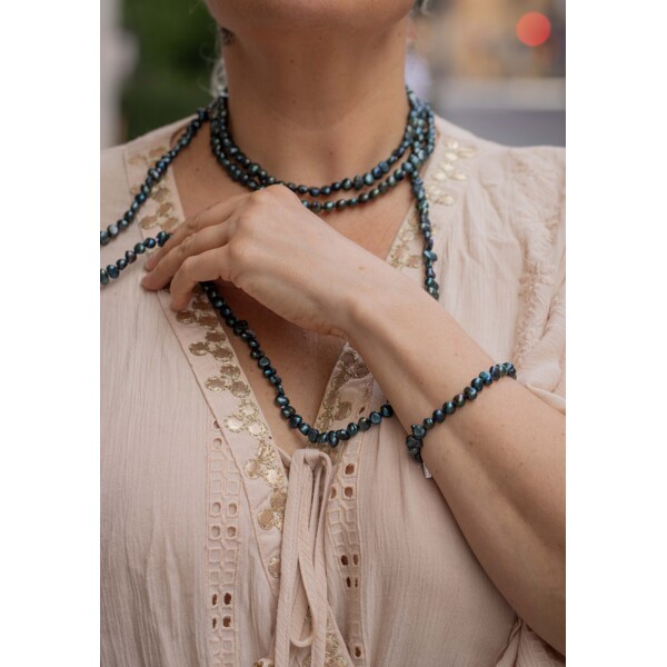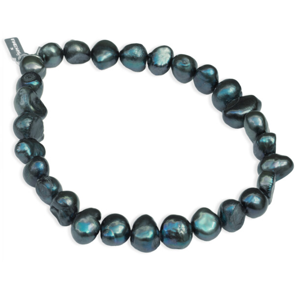 Et mørkegrønt elastisk perlearmbånd med ægte ferskvandsperler.