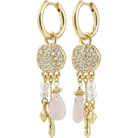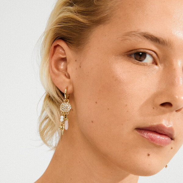 De guldbelagte SHIFT-hoops fra Pilgrims Moments of Change-kollektion er den ultimative kombination af boho chic og legende elegance. Små mønthængere, prydet med funklende Preciosa-krystaller, reflekterer lyset på en magisk måde, mens glasperler i perlemorsfarve og kærlighedsstenen rosakvarts giver en let og fri følelse. En legende kombination af detaljer, der giver dit look en drømmende og unik energi.